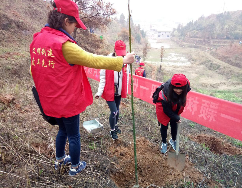 早上8.00由青年志愿者大队干事组织并且分发了志愿者衣服与帽子,同时讲解了本次活动的意义与相关事项等。本次植树活动学校领导高度重视,由老师亲自带队,乘坐校车前往植树活动地点。顺利到达指定地点后,在老师和青年志愿者大队干事的带领下赶赴植树场地。寂静的山头在鲜红的印有环保宣传标语的横幅和彩旗的印衬下显得生机勃勃。青年志愿者们满怀热情的分工、分苗、整地,现场气氛十分热烈。大家手持铁锹、锄头,干劲十足,将一颗颗充满生机和希望的树苗植入地里的同时也植下了自己绿色的希望之春。到处充满着青年志愿者们的欢声笑语。活动持续了大半天,种下了数不清的小树苗,大家仿佛看到了几年后山里山头上绿树挺立、生机勃勃的景象。