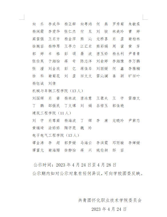 关于2023年“五四”评优拟推荐表彰 名单的公示
